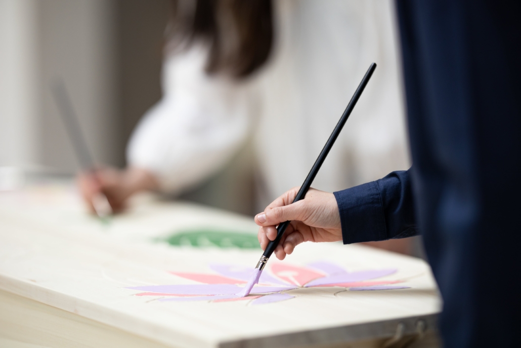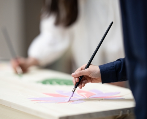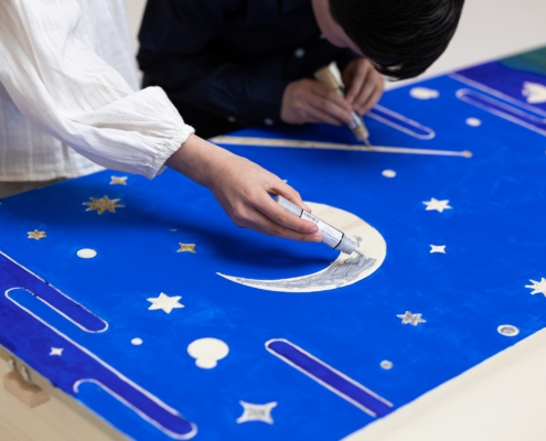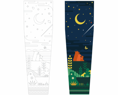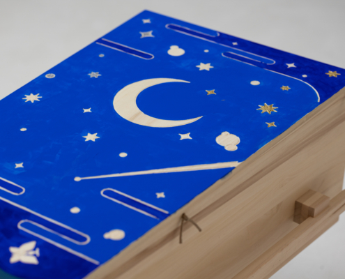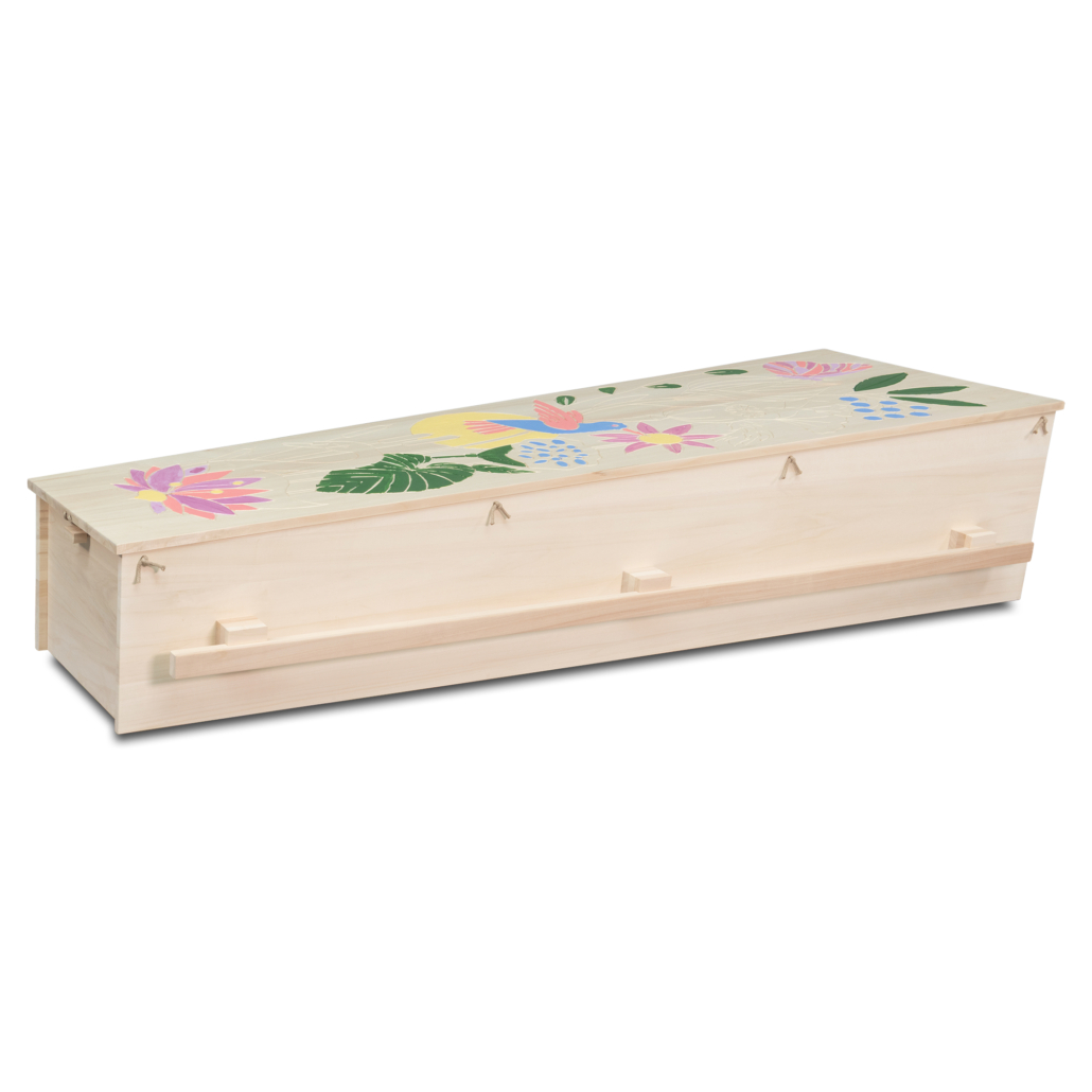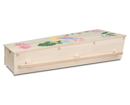 Kleurjekist levert uitvaartkisten met in de deksel een gefreesde illustratie. Je kunt kiezen uit de twee ontwerpen: Sterrenkijken met Beren (links) en Aan de Oever (rechts).